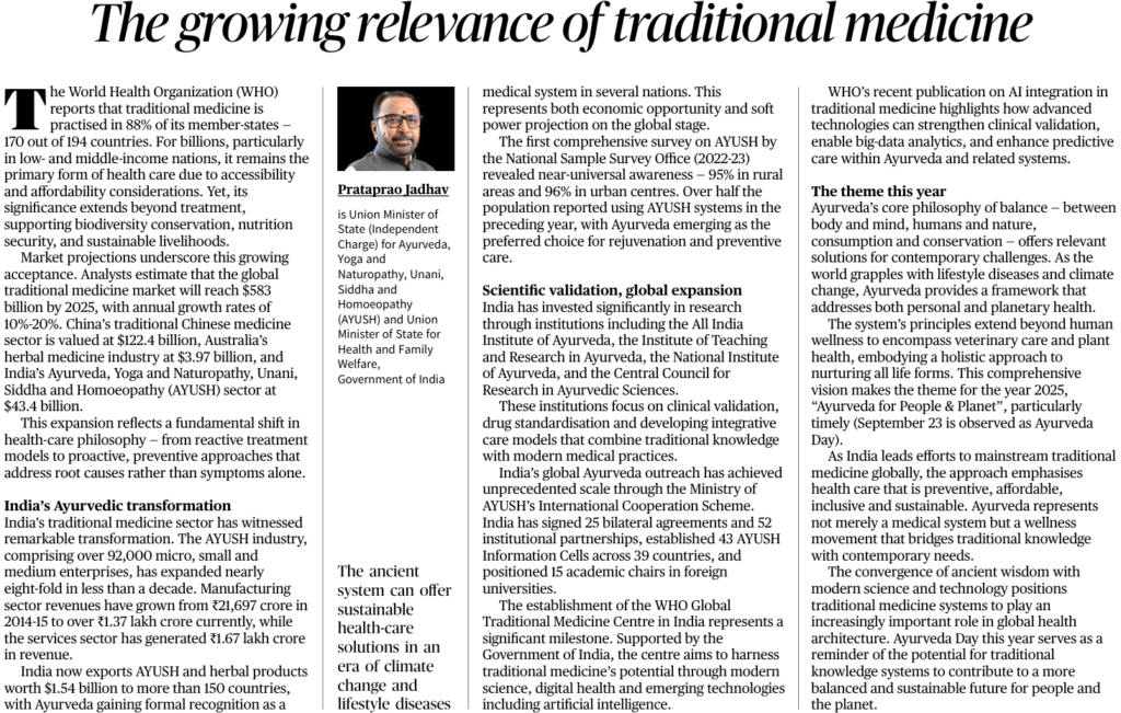 The editorial of The Hindu titled “The growing relevance of traditional medicine” by  suggests that traditional medicine (like Ayurveda) is gaining global relevance by integrating with modern science and technology to address healthcare needs.